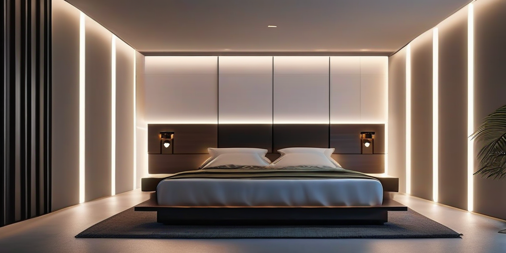 遮光性の高いブラックアウトカーテン、室温と湿度を一定に保つ空調、快眠を促すアロマやサウンドスケープ(ホワイトノイズなど)を制御できるIoTシステムを統合します。 - 照明設計:
